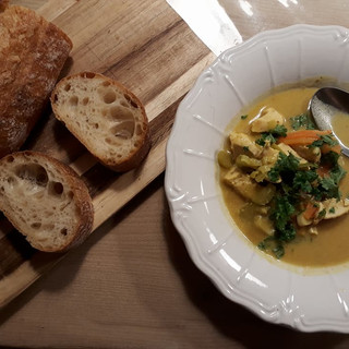 Start med at svitse løg, hvidløg og karry i olivenolie. Tilsæt hønsebouillon og kartofler skåret i stykker, og gulerødder koges møre og blendes. Tilsæt nu resten af ingredienserne og kog indtil kyllingen er kogt, ca. 10 min. Tilsidst tilsættes kokosmælk, salt, peber, citronsaft og ingefær.