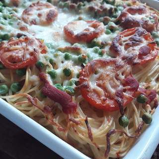 1 kg. Spaghetti. 500g. Kylling eller skinketern 200-300g. Frosne ærter 1 bk. Friske hvide champignon el. 1-2gl. Skive skårne svampe. 1 fl. Tomat puré 5 fed hvidløg 1 alm løg Revet mozarella 4 tomater skåret i skiver. 1 spsk. Paprika 1 tsk. Salt