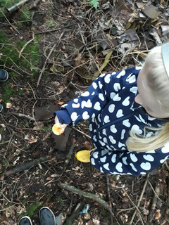 Det meste af weekenden har regnen silet ned, kun med korte ophold hvor solen har varmet så dejligt. Her til aften var ungerne blevet lidt rastløse og trængte til at få frisk luft, og de var helt med, da jeg forslog en hurtig tur i skoven hvor vi kunne tage på vores helt egen lille mikro eventyr på jagt efter krible krable dyr i skovbunden og på jagt efter tegn på den årstid vi lige er begyndt på. Det regnede meget af tiden mens vi var i skoven men kun få dråber trængte igennem de store trækroner der endnu ikke er begyndt at tabe bladene. Det er utrolig dejligt at komme ud i den stille skov, og opleve hvordan pigerne drages af hvad der er under næste blad, bag ved det næste træ. Og selv om vejret måske ikke er helt oplagt til en tur i det fri, kan det nemt være årsag til at oplevelsen bliver helt anderledes på den gode måde og ofte oplevet noget nyt.